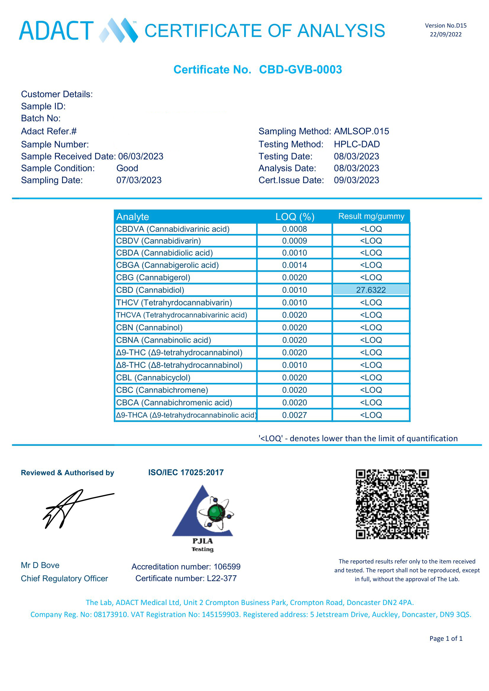 Cannabis Sativa L (Broad Spectrum), Sugar, Glucose, Syrup, Water, Wheat, Starch, Modified Maize Starch, Acids (Lactic Acid, Malic Acid, Citric Acid), Modified Potato Starch, Acidity Regulators (Sodium Malates, Sodium Hydrogen Carbonate),Plant and Vegetable Concentrates (spirulina, Safflower, Black Carrot), Flavouring, Colour (Curcumin).Carrier Oil: MCT Oil