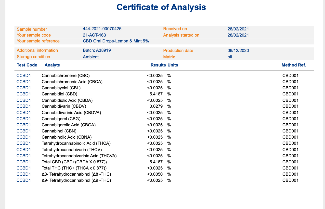Ingredients: MCT Oil, Full Spectrum Hemp Extract, (6%, Including 5% CBD), L-Menthol, Tangerine Flavouring