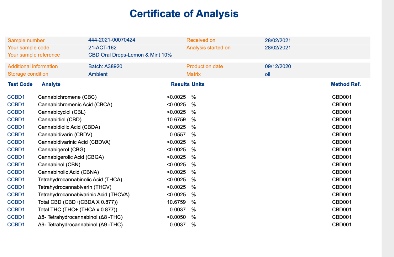Ingredients: MCT Oil, Full Spectrum Hemp Extract, (12%, Including 10% CBD), L-Menthol, Tangerine Flavouring